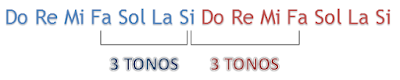 Si partimos de un DO mayor pasamos hasta RE por un tono, hasta MI otro tono, hasta FA un semitono y como necesitamos un semitono más para llegar completar tres tonos convertimos el FA sin alteraciones en un FA sostenido, lo que viene a ser aumentar un semitono más.